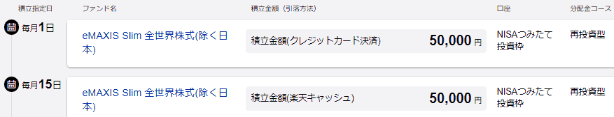 (クレジットカード決済)と(楽天キャッシュ決済)それぞれの上限5万円ずつで積立。